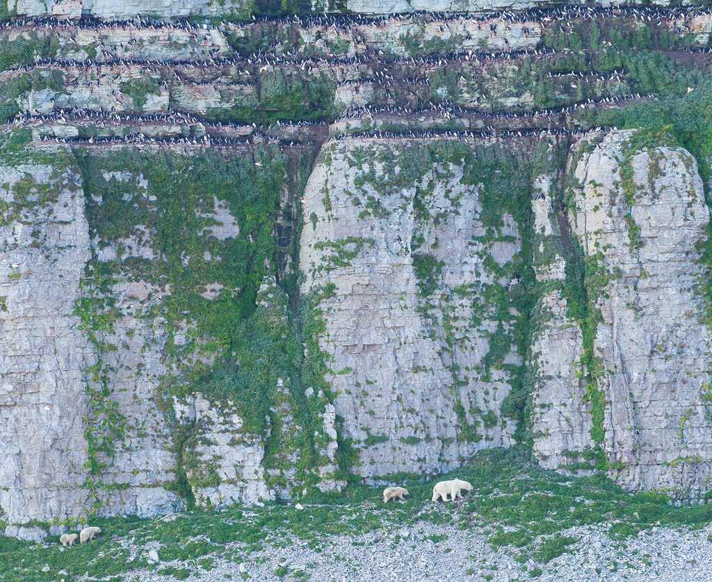 The bears simply patrol the bottom of the vertical cliffs, waiting for eggs and/or young chicks to accidentally fall (there are literally millions of birds nesting in these cliffs, all around the island). In the second pic, they’re feeding on a bird, thus the bloody paws.