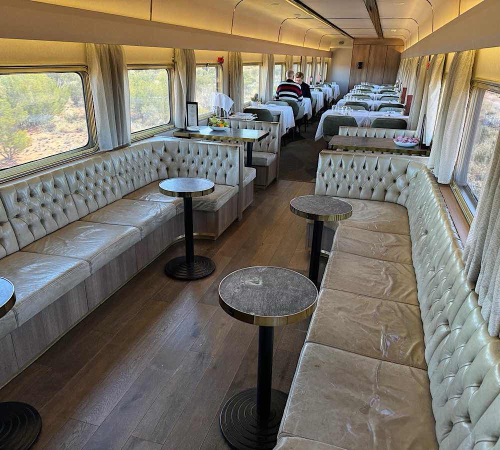 The lounge/dining car. I’m trying to upload video of the wonderful red soil desert flying by, as one gazes out the window, but so far Aussie wifi is not behaving. Stay tuned.