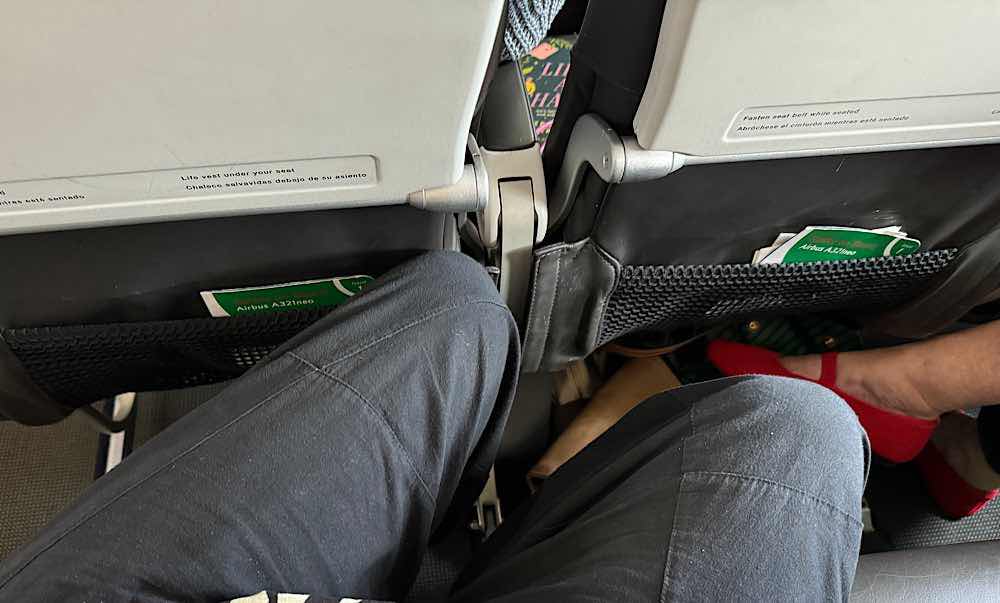 Next flight, from London to Athens - not so much fun. The front dozen or so rows were shown as 2-2, as opposed to the 3-3 configuration further back. One might think “more comfortable”. Wrong. ALL rows were 3-3, in the front area they just put people in the aisle and window seats, leaving the middle seat open. Virtually no legroom, at least for the likes of me.